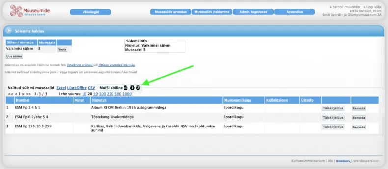 Sülemivaatesse lisab MuISi abiline nupud printimiseks ning sülemi alla laadimiseks tabel-kujul (CSV) koos museaali ID-ga.